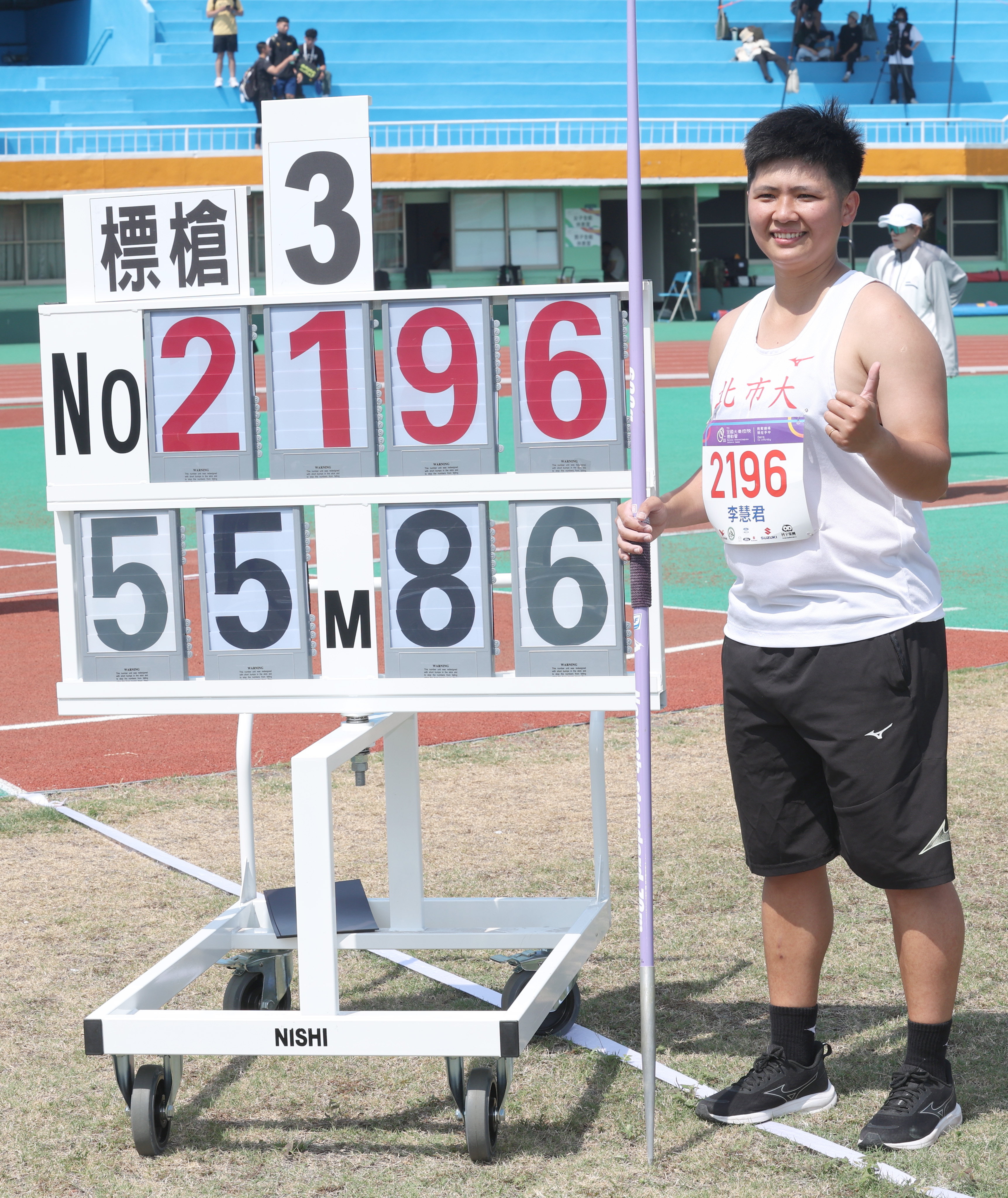 延續上個月手感,北市大學李慧君在114年全大運田徑公開女生組標槍決賽,以55公尺86打破大會紀錄摘金(111年蘇朝綺的55公尺32),但她賽後懊惱第五次試擲,差一點就有機會突破個人保持的全國紀錄,距離夠但最後卻出界。